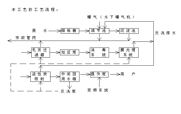 方案簡介: 1. 細格柵:自己制作為細網狀或直接向廠家定做 2. 調節池一般設計為1.5-2.0h的水力停留時間,并向其內曝氣(為了減輕調節池發生厭氧反應而產生的異味),一般采用水下曝氣機。池底設有放空管,池頂設有溢流孔。 3. 沉淀池一般設計為0.5-0.8h的水力停留時間,池子以斗形為宜,池底設有放空管或設良好量較小的排污泵亦可,池頂設有溢流孔,調節池與沉淀池的污水經過地下排污溝排到排污池經排污泵排入市政管網。 4. 毛發過濾器,以小孔徑的毛發過濾器為宜,截留原水中的毛發等大的顆粒物,為保護后續膜設備而設,其自設反洗管管路【水處理設備】,可設計為每天反洗一次,每次10分鐘。 5. 加壓泵為一備一用而設(本工藝采用流量為16m3/h,揚程80m,功率5.5Kw,南方泵業CDL16-100)為后續系統增壓而設。 6. 消毒設備(本工藝消毒設備為專利技術,市場很難買到,其主要作用是去除原水中的有害微生物、細菌等對人體有害菌)可采用臭氧強氧化劑。 7. 膜處理系統,主要采用中空纖維膜(本工藝中采用8根Φ200的中空纖維膜,其進水流量維持在12 m3/h,出水維持在10 m3/h左右,本系統原設計為每天反洗一次,但實際運行2個月后,效果不理想,改為每小時反洗10分鐘,保護中空纖維膜),以后設計在前期設計的水要經過十分精細的過濾,這樣不會使膜堵塞,保持系統的正常運行。其運行壓力為0.1-0.3MPa。 8. 活性炭吸附,由膜出來的水經過活性炭吸附,去臭、去味還可吸附水中的膠體物質(如果活性炭吸附系統前置在膜系統之前則1公斤活性炭處理水量8-12噸,活性炭的壽命會很短,很快更換活性炭,而其后置則為前置的20倍左右,提高活性炭的使用壽命,活性炭后置脫氯1公斤活性炭處理水量30噸左右,做直飲水時亦如此)本工藝活性炭罐設計為每天反洗一次,每次10分鐘,罐體設計為Φ1600,有效高度為2000,凈高2800,實際裝填量為75%。 9. 中水回用池設計為3小時的水力停留時間,在中水回用池底設有放空管,頂部設有溢流孔,中水回用池上部設有自來水補給管道。 10. 提升泵,本工藝供給4座辦公樓沖廁用水,有高層和低層,故選用南方泵業型號為CDL4-60與CDL4-140(立式泵)并選用CDL4-140一臺做為前面的幾個系統的反洗泵。 電器控制部分: 電器控制部分可分為控制加壓泵運行、提升泵運行以及反洗幾個方面。 ① 加壓泵受沉淀池和中水回用池內的液位控制器來控制:<1>.若沉淀池內水位達到設計要求而回用池內水位較低,加壓泵運行;若沉淀池內水位未達到設計水位,回用池內水位較低,加壓泵不運行,自來水補給閥門打開。<2>.沉淀池內水位未達到設計要求,而回用池內水位達到設計要求,加壓泵不運行;沉淀池內水位未達到設計要求,而回用池內水位達到設計要求,加壓泵不運行。 ② 提升泵受各樓中水水箱內的液位控制器的控制以及中水回用池內液位控制器的控制:<1>.中水回用池內處于低水位時,提升泵不運行;<2>.中水回用池內水位達到設計要求,各樓中水水箱內水位處于高水位時,提升泵不運行,處于低水位時,提升泵運行。 ③ 反洗方面,在系統正常工作時,毛發過濾器、膜系統以及活性炭系統的正常出水的電磁閥打開,反洗電磁閥關閉,每天設定的反洗程序啟動,毛發過濾器、膜系統以及活性炭系統的正常出水的電磁閥關閉打開:<1>.首先是活性炭罐的反洗閥門打開,進行反洗;<2>.其次是膜系統的反洗閥門打開,進行反洗;<3>.比較后是毛發過濾器的反洗閥門打開進行反洗。 ④ 排污坑內設一液位器,來排掉從調節池、沉淀池、回用池以及從毛發過濾器內排出的污水。 本工藝較傳統的活性污泥法相比較優點在: 1. 出水水質明顯優于活性污泥法的出水水質; 2. 占地面積小,比活性污泥法的占地面積節省50%以上; 3. 運行簡單,基本可實現無人職守; 4. 不受溫度、水量的變化; 5. 設備結構緊湊,可根據實際情況連續運行,易維護。 本工藝易產生的現象是運行時膜系統易堵塞,要求前期水質較好。