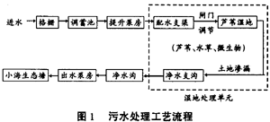 污水進入濕地處理單元——蘆葦濕地系統,生活污水在周圍筑有壩埂的蘆葦濕地中,通過對配水閘門的調節,使其保持一定的深度,經過一定時間的培養,在每個單元內形成了一個相對獨立的簡單的生態系統,見圖2。