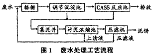 周期循環活性污泥系統(CASS)[2-3]是本廢水處 理系統的核心單元,大部分有機污染物在本反應器中進行生物降解而去除。CASS是美國Goronszy教授研究開發的新型好氧生物處理技術,其反應器設有一個分建或合建式的生物選擇器,是以曝氣-非曝氣方式運行的充放式間歇活性污泥處理工藝,在一個反應器中完成有機污染物的生物降解和泥水分離的處理功能,整個系統以推流方式運行,而各反應區則以完全混合的方式運行,實現同步碳化和脫氮除磷功能。