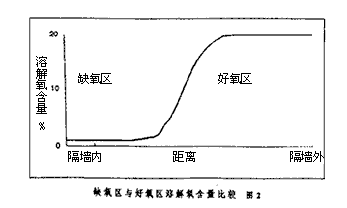OCO工藝的一個(gè)主要特點(diǎn)是:好氧區(qū)與缺氧區(qū)之間的污水交換,即內(nèi)回流不需泵送,以上兩個(gè)區(qū)域之間有一段是相通的。兩者之間的交換形式及量的大小是依靠攪拌器的控【水處理技術(shù)】制來(lái)實(shí)施,因此節(jié)省能耗。當(dāng)攪拌器運(yùn)轉(zhuǎn)時(shí),湍流增強(qiáng),好氧區(qū)與缺氧區(qū)混合程度增強(qiáng),當(dāng)攪拌器停止運(yùn)轉(zhuǎn)時(shí),兩區(qū)之間的混合程度較低。此時(shí)測(cè)得的溶氧狀況如圖2所示,好氧區(qū)與缺氧區(qū)的區(qū)分很明顯。OCO反應(yīng)池的構(gòu)造和攪拌器的循環(huán)工作可保證好氧區(qū)和缺氧區(qū)之間很高的回流比,這種頻繁的變化是該工藝有效脫氮的關(guān)鍵之一。