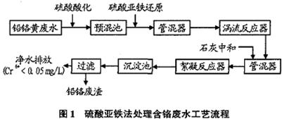 采用硫酸亞鐵還原廢水中的6價鉻,并用石灰中和,形成難溶于水的氫氧化鉻。利用硫酸亞鐵在酸性條件下,將6價鉻還原成3價鉻,在一定溫度和堿度條件下,產生氧化鐵和氧化鉻共沉淀,利用壓濾機對廢渣進行分離,達到廢水治理的目的。硫酸亞鐵法治理工藝流程見圖1。