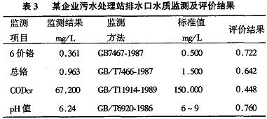 2007年1月某環境監測站對該企業污水處理站排水口進行了水質監測,監測項目為6價鉻、pH、總鉻和CODCr4項,具體監測數據及評價結果見表3。