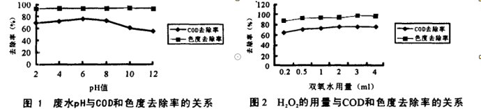 由圖看出,隨著雙氧水溶液加入量的增多,廢水COD和色度去除率并非一直增大,而是達比較大值后趨于穩定,雙氧水溶液加入量在2m1/L時為宜,這樣即能有很高的處理效果,又可減少藥劑投加量。